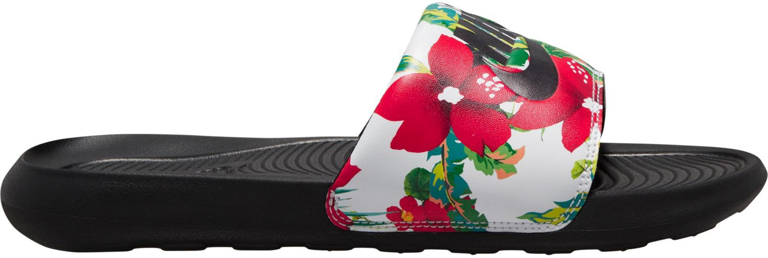 Show off your casual sporty style in the Nike Women's Victori One Printed Slides. These slide sandals feature a soft foam construction and mechanical cushioning that adds responsiveness and comfort. The patterned outsoles allow for added traction, while the bold Nike logos, Swoosh designs and patterns on the straps add a touch of style.