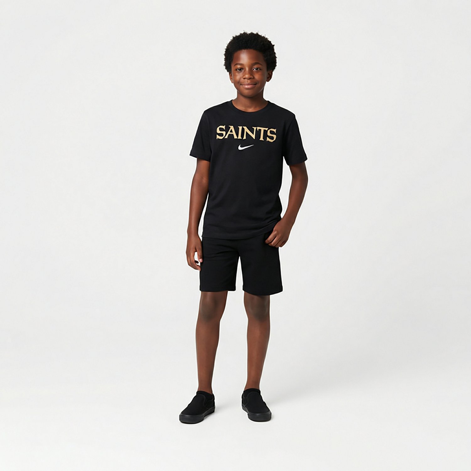 Display team support while looking stylish with the Nike Youth New Orleans Saints Team Wordmark Short Sleeve T-shirt. The cotton material is built for constant wearing, and the front screen-printed wordmark graphic shows your passion. The short sleeves enable quality airflow, and the collar creates a classy appearance.
