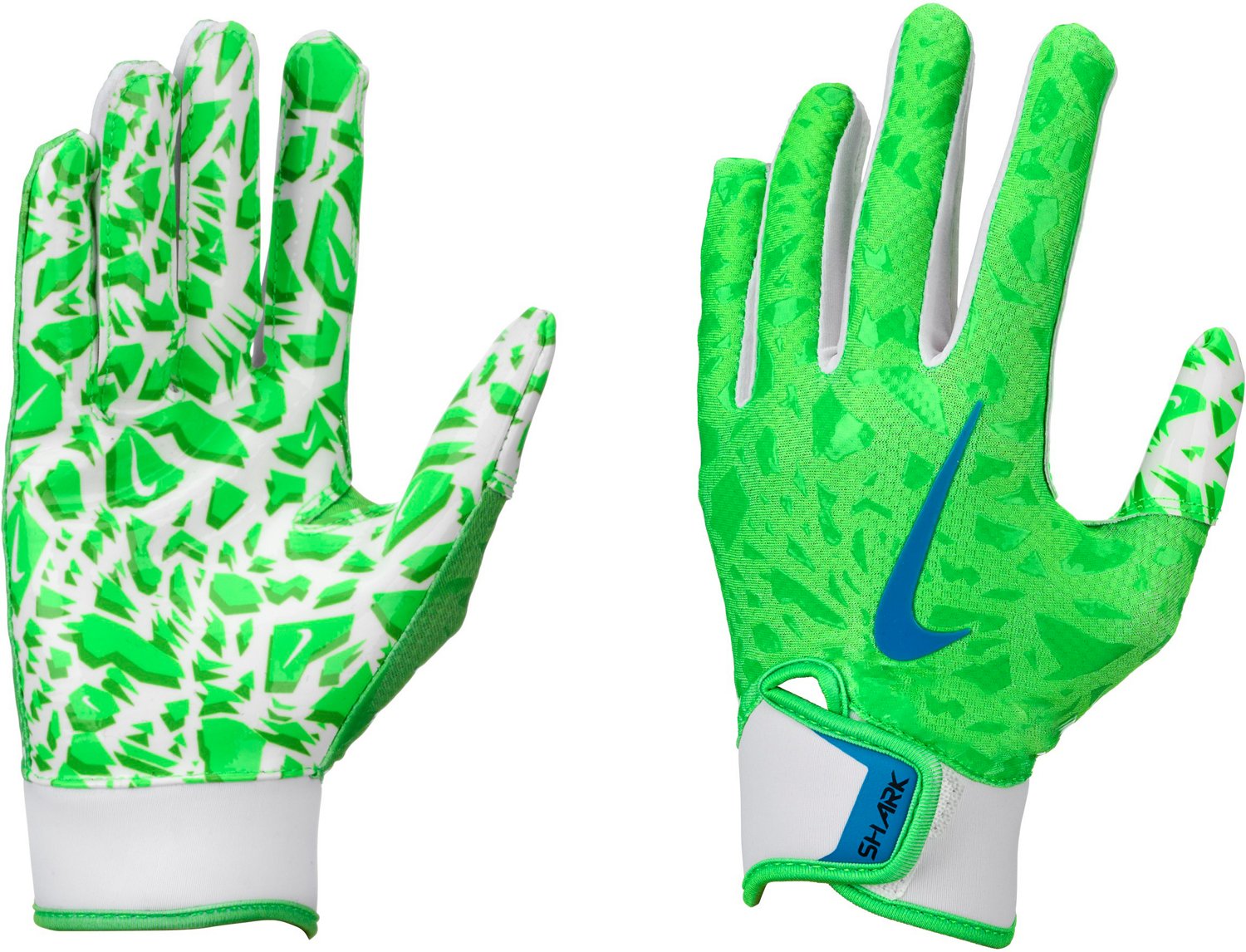Make a game-changing catch when you wear the Nike Youth Shark 2.0 Football Gloves. The backs are made of a lightweight, stretchy blend of 78% polyester, 14% PU leather and 8% spandex, while the sticky Magnigrip palms offer a reliable catching surface. The adjustable cuffs provide a custom, comfortable fit.
