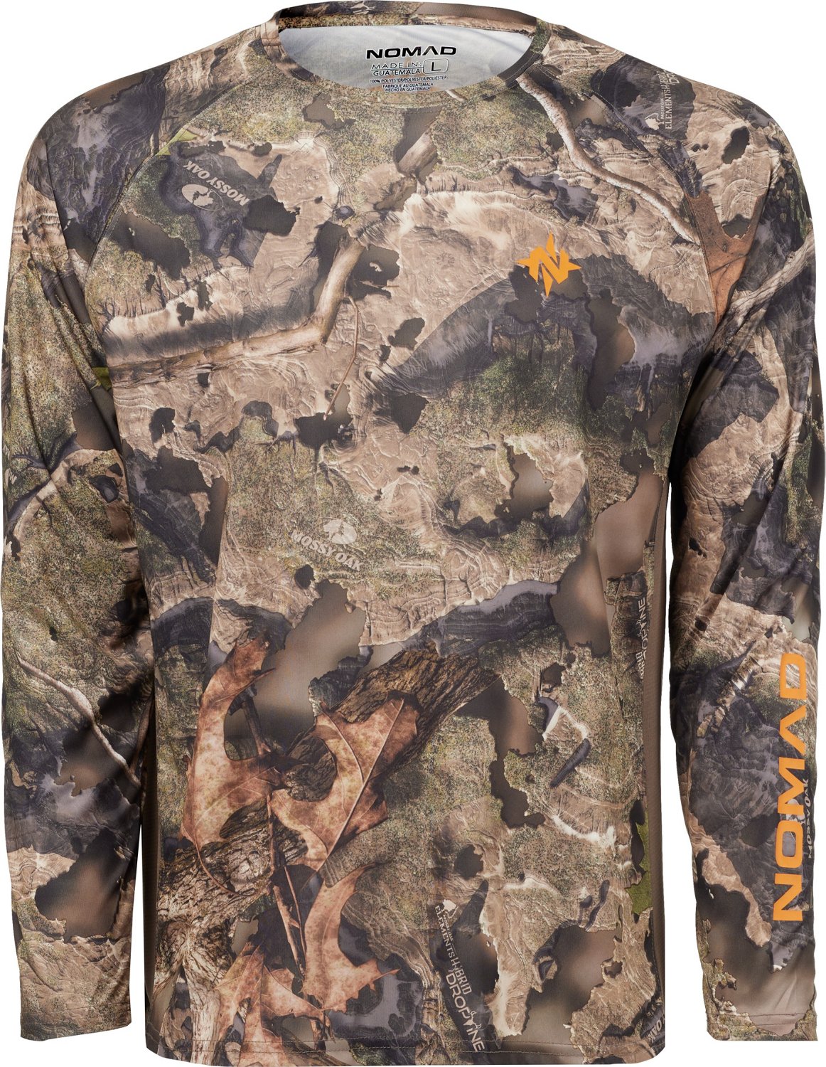 Tackle the outdoors in comfort with the Nomad Men's Pursuit Mossy Oak Droptine Long Sleeve T-Shirt. Made from a blend of polyester and spandex, the shirt offers breathability and stretches for day-long comfort. The fabric wicks sweat, fights odors, resists stains and provides UPF 30 sun protection. An allover Mossy Oak camouflage print shows off your rugged style.