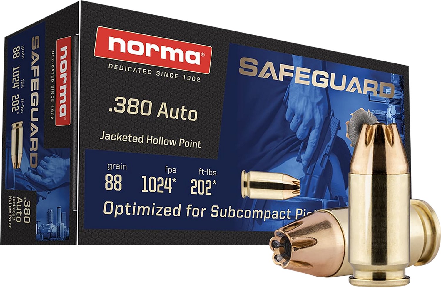 The Norma USA Safeguard .380 ACP 88-Grain Ammunition - 50 Rounds is a centerfire ammunition designed for defense applications. It features a brass casing and a jacketed hollow point construction for enhanced stopping power.