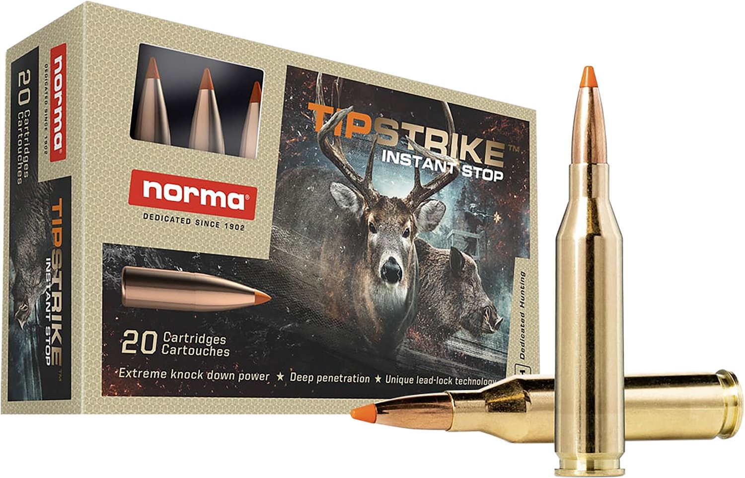 Use the Norma USA Tipstrike Polymer Tip 243 Winchester 76-Grain Centerfire Rifle Ammunition - 20 Rounds on your next hunting trip. Made with brass casing materials for durability, this ammo comes with a polymer tip bullet type.