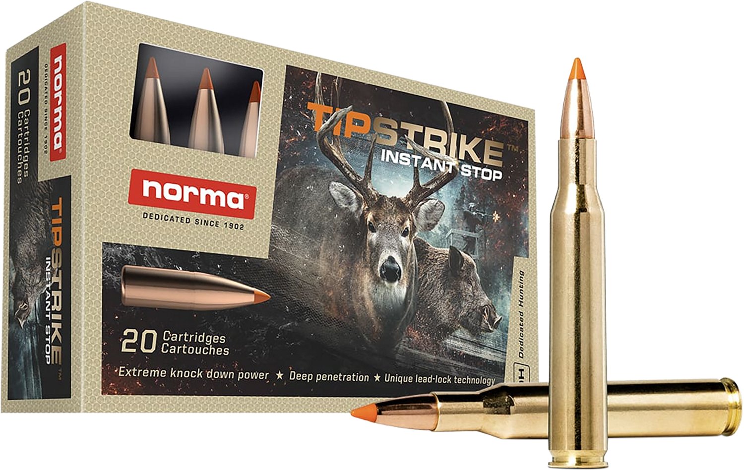 Use the Norma USA Tipstrike Polymer Tip 270 Winchester 140-Grain Centerfire Rifle Ammunition - 20 Rounds on your next hunting trip. Made with brass casing materials for durability, this ammo comes with a polymer tip bullet type.