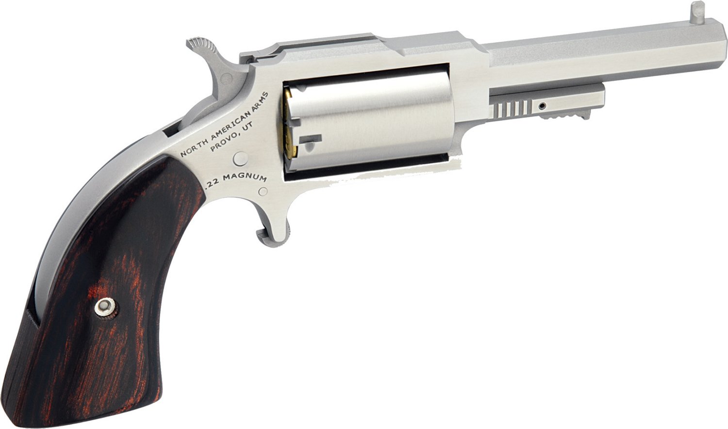 Designed with a compact frame and a 2.5-inch barrel, the North American Arms 1860 Sheriff .22 WMR Revolver is crafted from stainless steel with wooden grips. This revolver features a bead front sight, an exposed hammer and a .22 LR conversion cylinder that fits inside the .22 Magnum frame for use with a broader range of ammunition.
