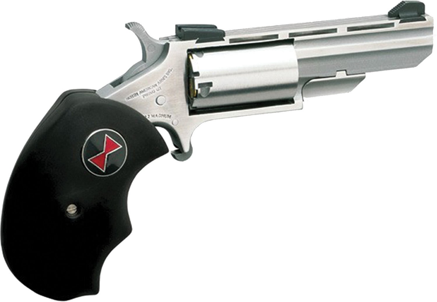 The North American Arms Black Widow .22 WMR Revolver is made of stainless steel with a 2-inch vent barrel and a bull cylinder. The oversize rubber grips display an hourglass icon, and the revolver features low-profile, fixed Millet sights.
