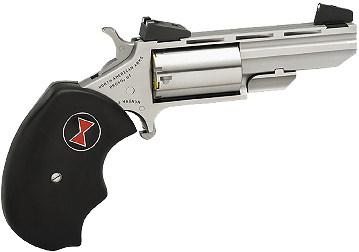 The North American Arms Black Widow 22LR Revolver has a 1.63-inch barrel and a steel frame. It also has rubber grips, adjustable sights and a safety cylinder/half notch.