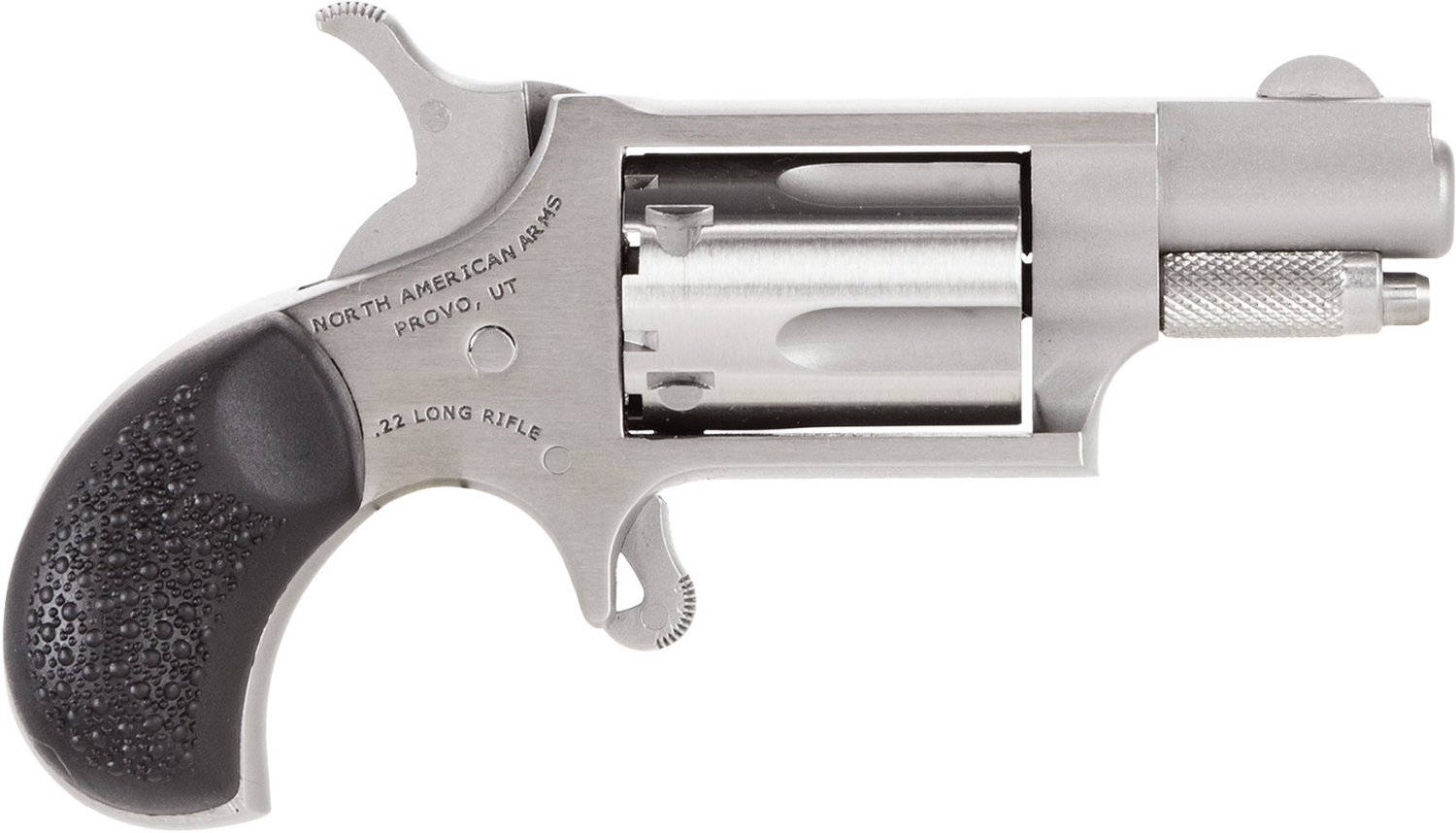Carry the North American Arms Carry Combo .22 WMR Mini Revolver inside the included holster for personal protection. With a compact, stainless-steel frame, this gun features an exposed hammer, fixed sights and a halfway notch cylinder safety. The grip is made from rubber and has a checkered design. 5-round capacity.