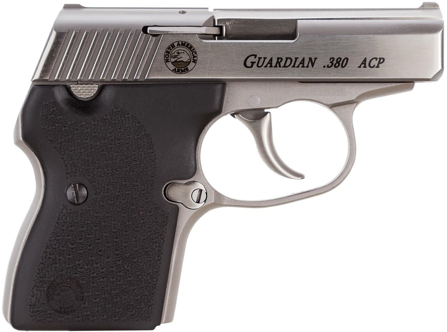 The North American Arms Guardian .380 ACP Pistol has a steel frame with a 2.49-inch barrel and fixed sights. Weighing 18.72 ounces, this semiautomatic handgun features a 6+1 capacity, black synthetic grips, and a stainless finish.