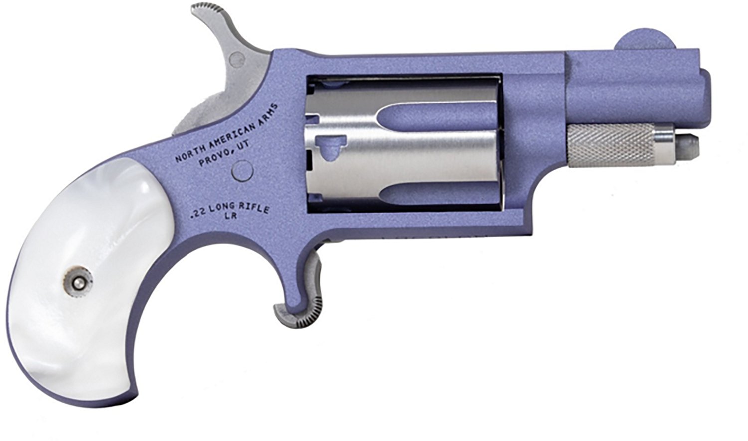 Designed for a range of shooting applications, this North American Arms Mini-Revolver .22 LR Revolver features a steel frame with a white pearl grip and a stainless cylinder, plus a 1.125-inch barrel with a Cerakote finish. It also has fixed sights.