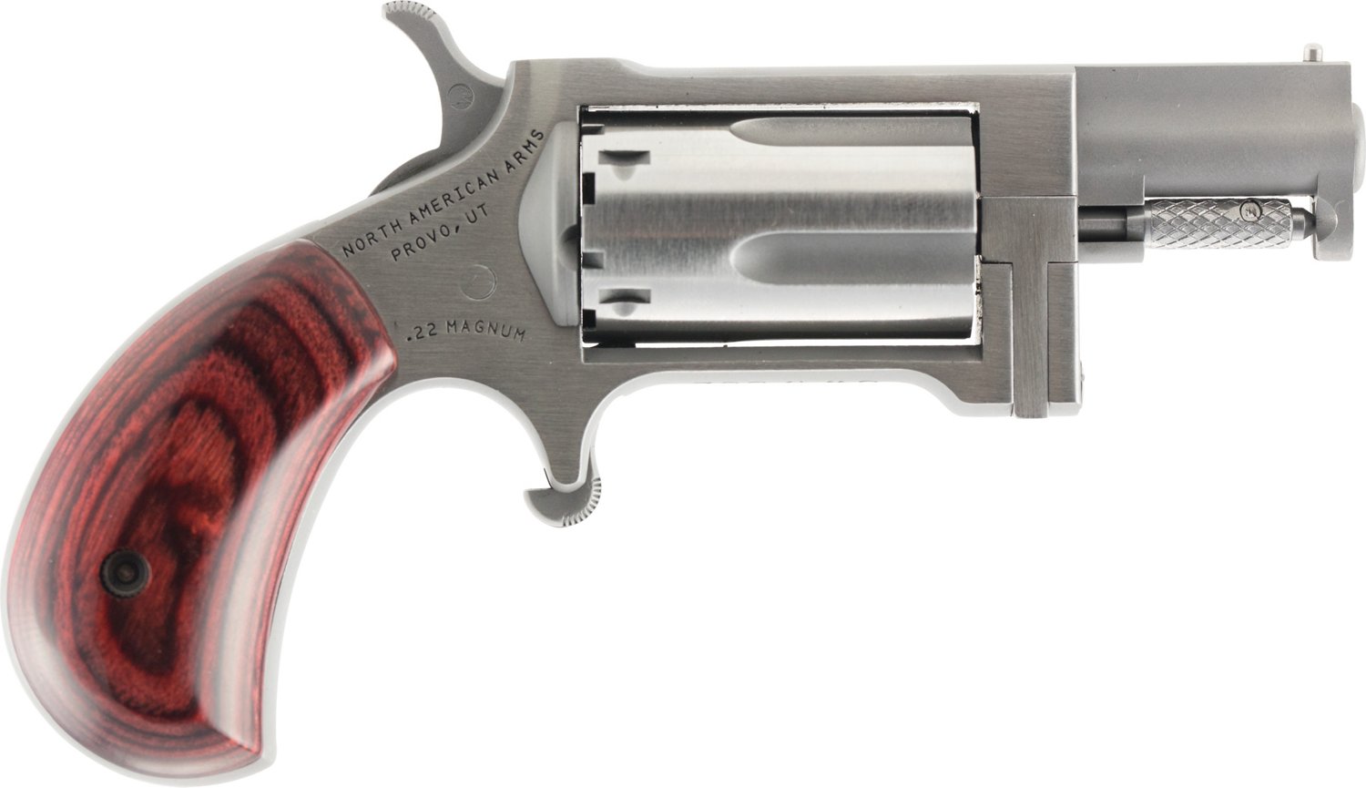 Designed with a compact frame, the North American Arms Sidewinder .22 WMR Revolver is a 5-shot, single-action handgun with a 1.5-inch barrel. This revolver features rosewood bird's-head grips, as well as a stainless post sight.