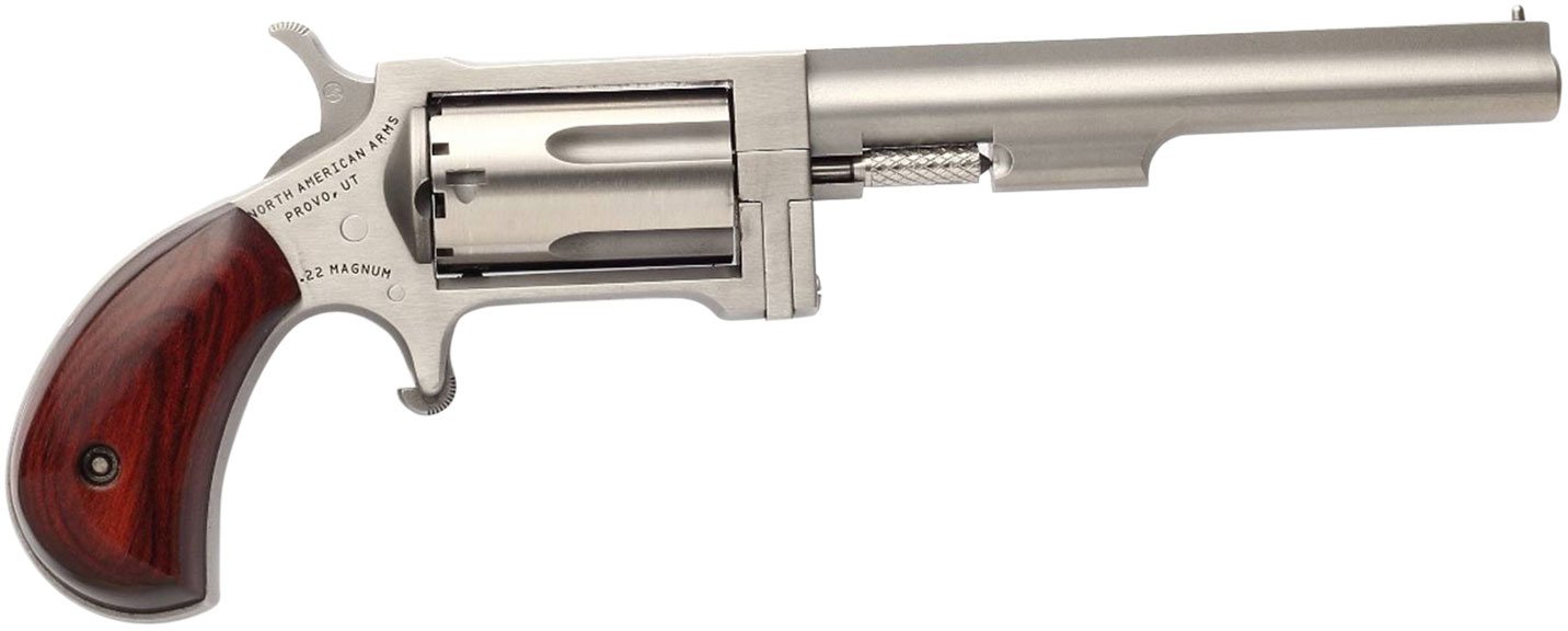 The North American Arms Sidewinder .22 WMR Revolver is crafted with a small frame that features a 4-inch barrel and rosewood grips. The barrel, frame and slide are finished in stainless steel, and the hammer is exposed. Fixed sight.