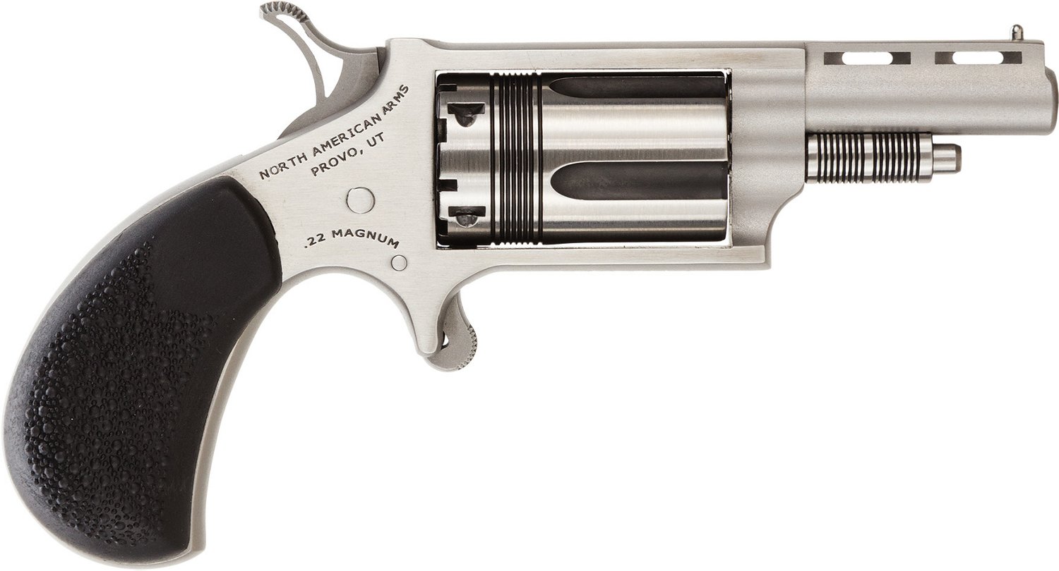 Designed for concealed carry with the halfway notch cylinder safety, the North American Arms The Wasp .22 LR/.22 WMR Revolver has a 5-round capacity. It's made from a stainless-steel barrel with vent bar and a stainless-steel cylinder and frame. Texturized rubber and rosewood bird's head grips. Bead front sight. Exposed hammer.