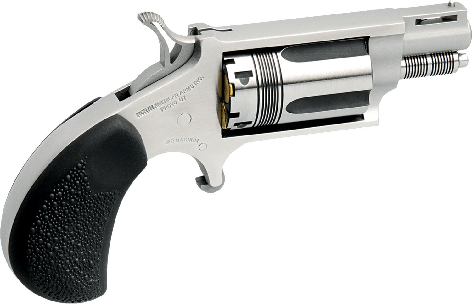 The North American Arms The Wasp .22 WMR Revolver has a small, lightweight frame for concealed carry. Its design includes a stylized cylinder, stainless-steel metal parts and pebble-textured rubber grips. Fixed bead front sight. Halfway notch cylinder safety. 5-round capacity.
