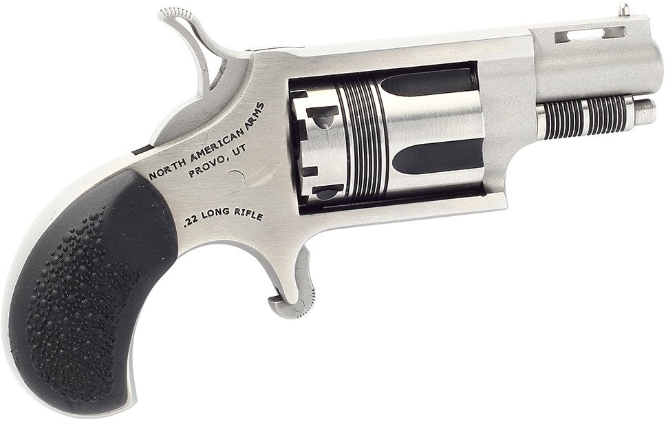 Finished in stainless steel, the North American Arms Wasp .22 LR Revolver is a 5-round handgun with a compact frame, a 1.125-inch barrel and an exposed hammer. This revolver is crafted with rubber grips and a bead front sight.