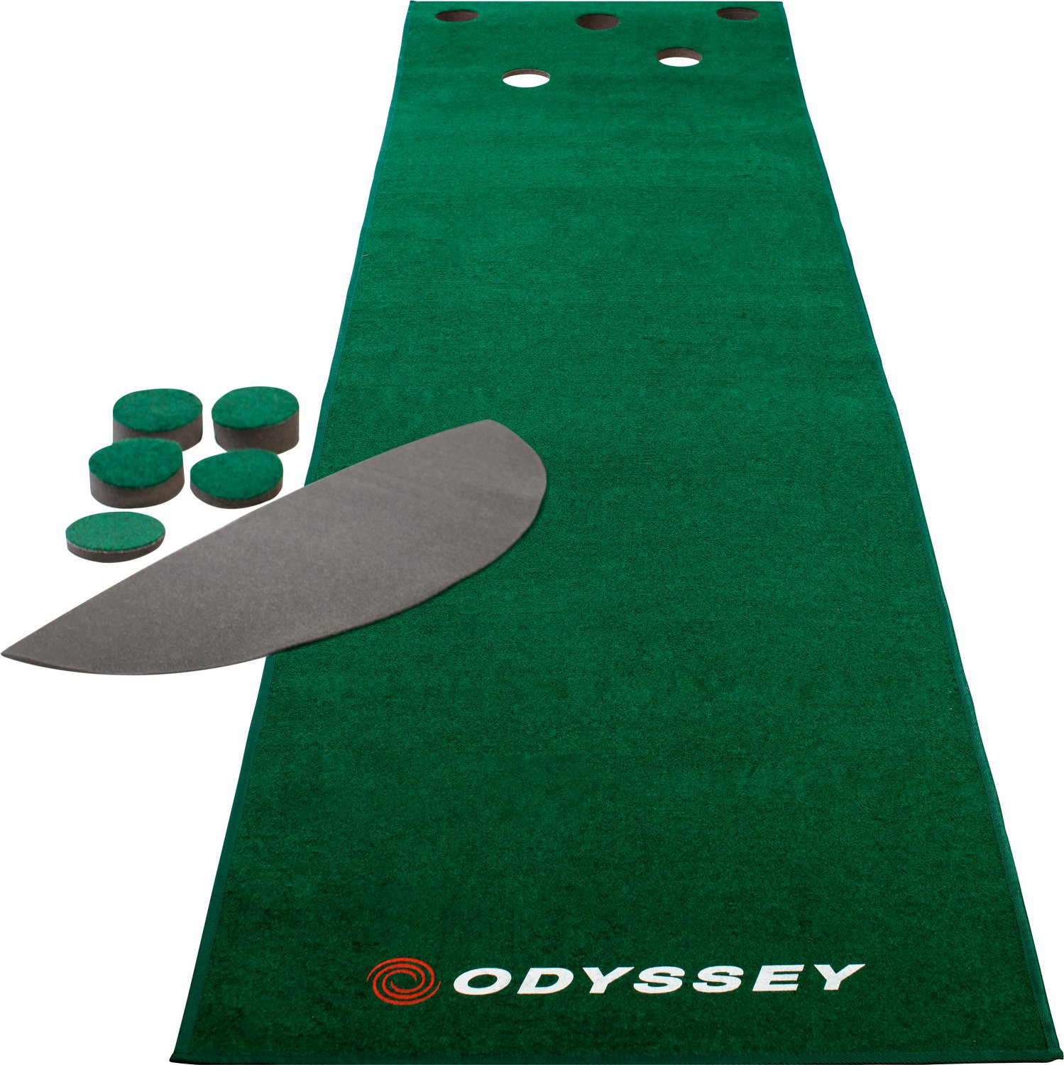 Practice your putting skills at home, in the office or on vacation with the Odyssey 12 ft Premium Putting Mat. The high-quality construction simulates a real green to help you get a feel for the surface, and the ramp incline leads to a group of 5 recessed holes which allow you to work on building the proper speed and muscle memory to consistently hit the ball into the hole. The optional foam wedge insert allows you to create various breaking putts that you might see on the course.