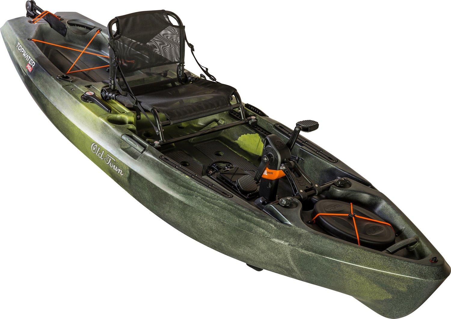 Pedal to the next spot with the Old Town Topwater PDL 10.5 ft Kayak, which features a PDL Drive so you can leave the oars at home. Crafted from single-layer polyethylene, this kayak uses a DoubleU™ hull for increased stability and comes with 1 ElementAir™ seat for comfort. It has a QuickSeal hatch to keep the important things dry. Made in USA.