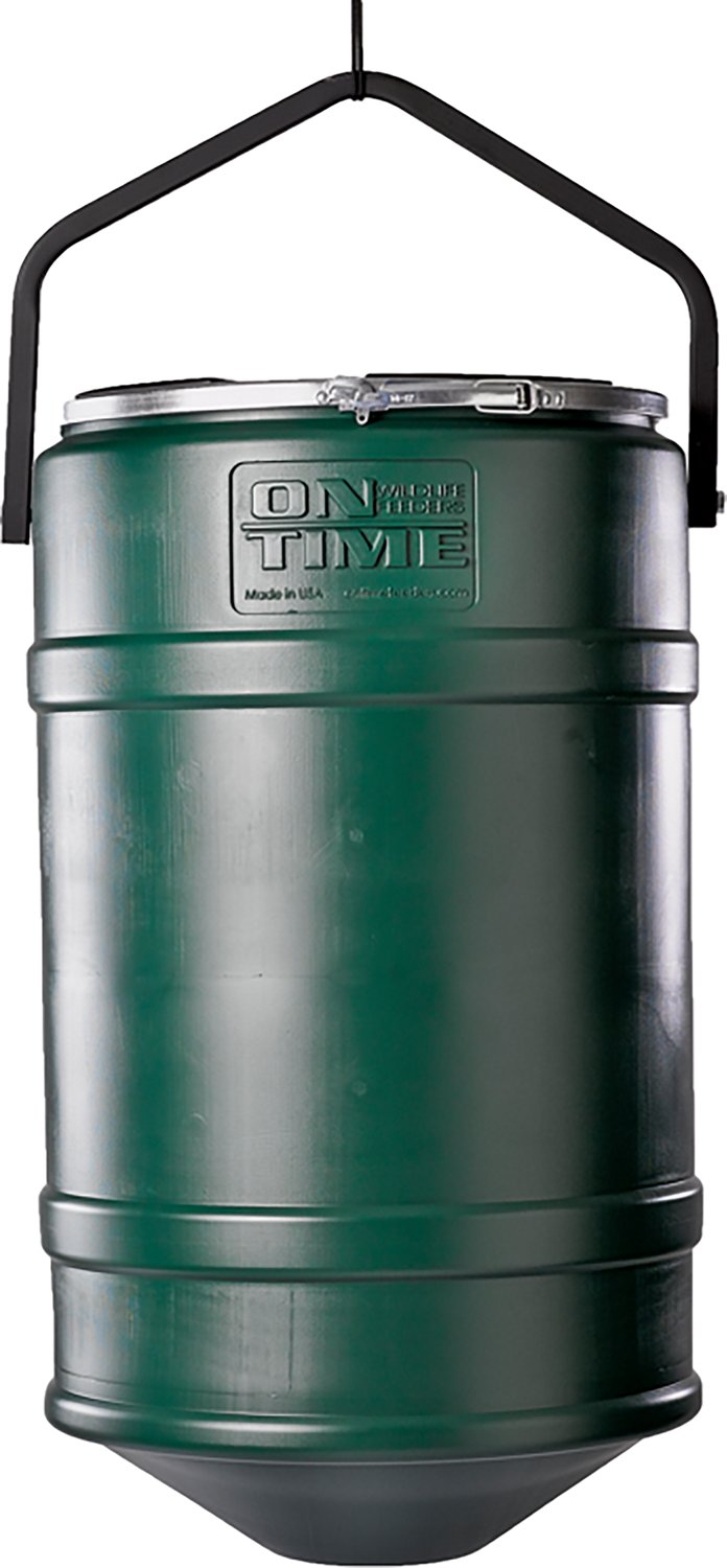 Defend against water leaks with the On Time Feeders 32 gal Hanger Combo. The conical design allows for continuous feed flowing, while the lid helps prevent water build-up.
