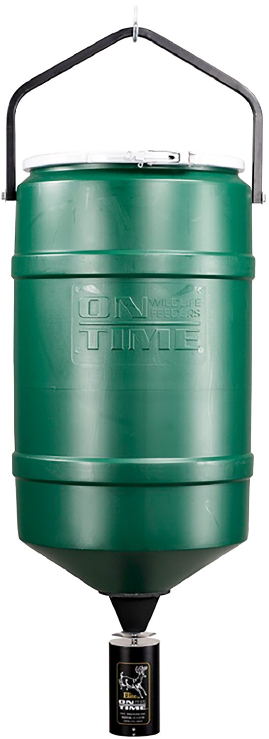 Draw deer to your hunting site with the On Time Feeders Elite 200lb Hanger Feeder Kit. This hanging feeder withstands tough use and holds up to 200 pounds of corn. The conical bottom and aluminum spin plate dispense food in a 360-degree circle, while the digital ustomizable timer allows you to set a feeding schedule. Set up to 6 feeding times between 1 and 30 seconds each to fit your needs.