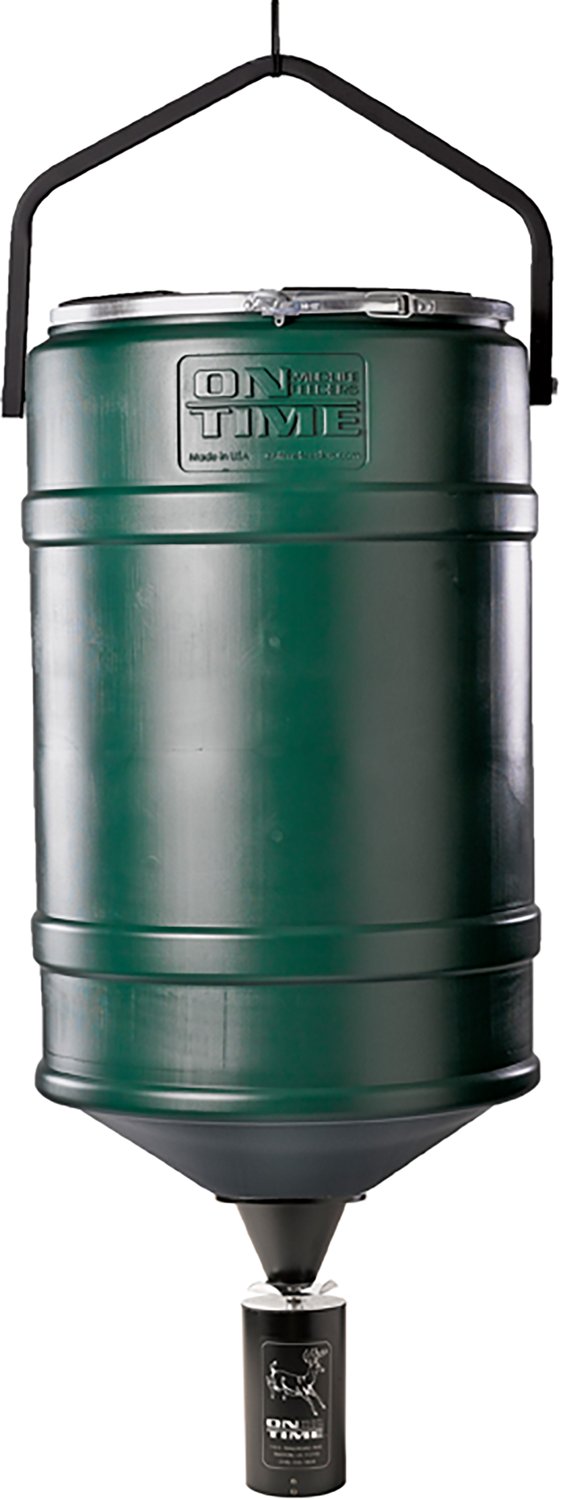 Draw deer to your hunting site with the On Time Feeders Lifetime 200lb Hanger Feeder Kit. This hanging feeder withstands tough use and holds up to 200 pounds of corn. The conical bottom and aluminum spin plate dispense food in a 360-degree circle, while the customizable timer allows you to set a feeding schedule. Set up to 12 feeding times between 3-16 seconds each to fit your needs.