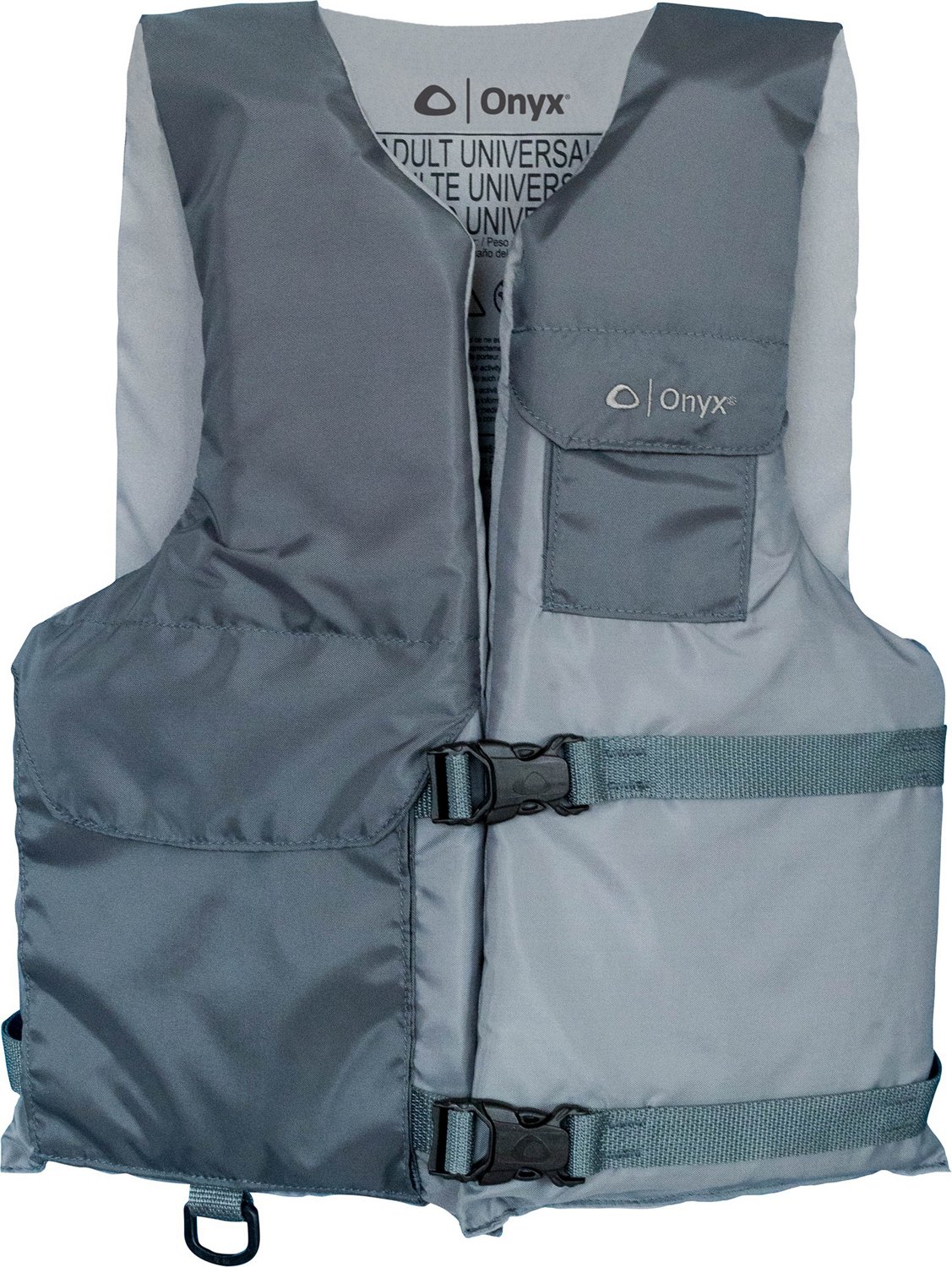 Be safe on the water with the Onyx Universal Sport Oversized Life Jacket. This oversized life jacket has adjustable belts to keep the vest in place for increased safety and protection. Roomy storage pockets are easy to access and keep your valuables and gear secure, while the D-ring attachment keeps small accessories from getting lost.