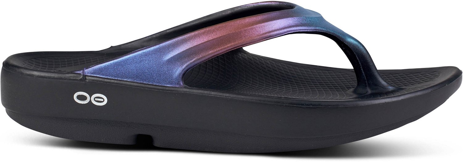 Step to it with the OOFOS Women's OOlala Luxe Recovery Sandals. The synthetic uppers afford durability, while the OOfoam™ recovery technology helps reduce stress on your feet, knees and back. The moisture and bacteria resistant design ensures a fresh feel. Indulge your feet in luxurious recovery. The OOlala Luxe boasts a feminine silhouette with targeted arch support specifically designed for women's feet. Slip on these plush cushions after a workout and experience pure comfort and accelerated recovery.