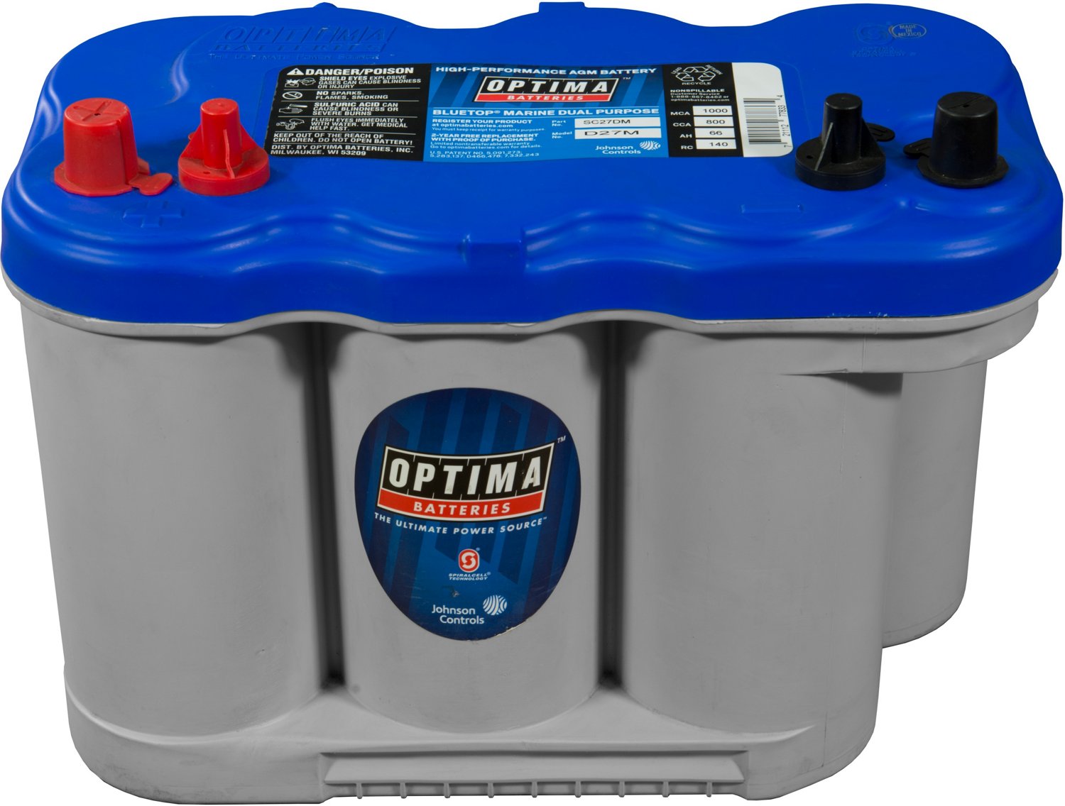 The OPTIMA® BlueTop D27M Marine Battery is designed for your boat or RV and features a high-purity lead and tin alloy plate with a polypropylene case and SPIRALCELL technology. Low internal resistance for efficient power output and fast charging. Absorbent glass plate.