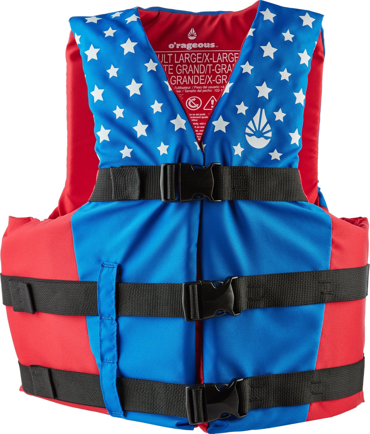 Stay safe and confident in the water when you have the O'Rageous Adults' Americana Nylon Life Vest. The nylon fabric offers durability and comfort. The layered foam core creates a consistent, floating performance. The quick release buckles help ensure easy on and off, while the Americana-themed design adds a bold, patriotic style to your look. CGA certified.