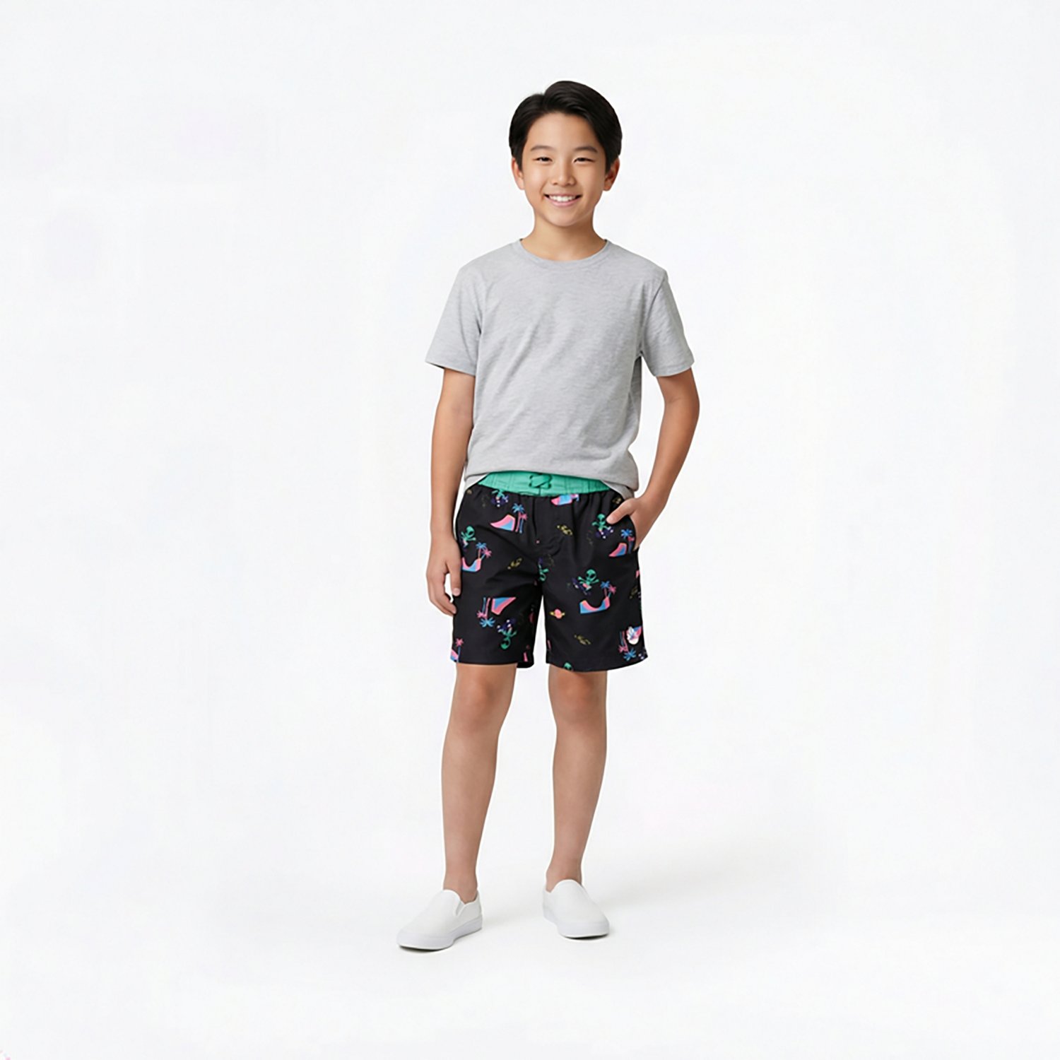 Keep him protected during your beach outing with the O'Rageous Boys' 4-7 Aliens Printed E Boardshorts. These comfortable boardshorts are made with a stretchy polyester and spandex blend with a playful aliens print so he can swim and play with ease. The UPF 50 sun protection shields his skin, while the adjustable waistband stays in place all day.