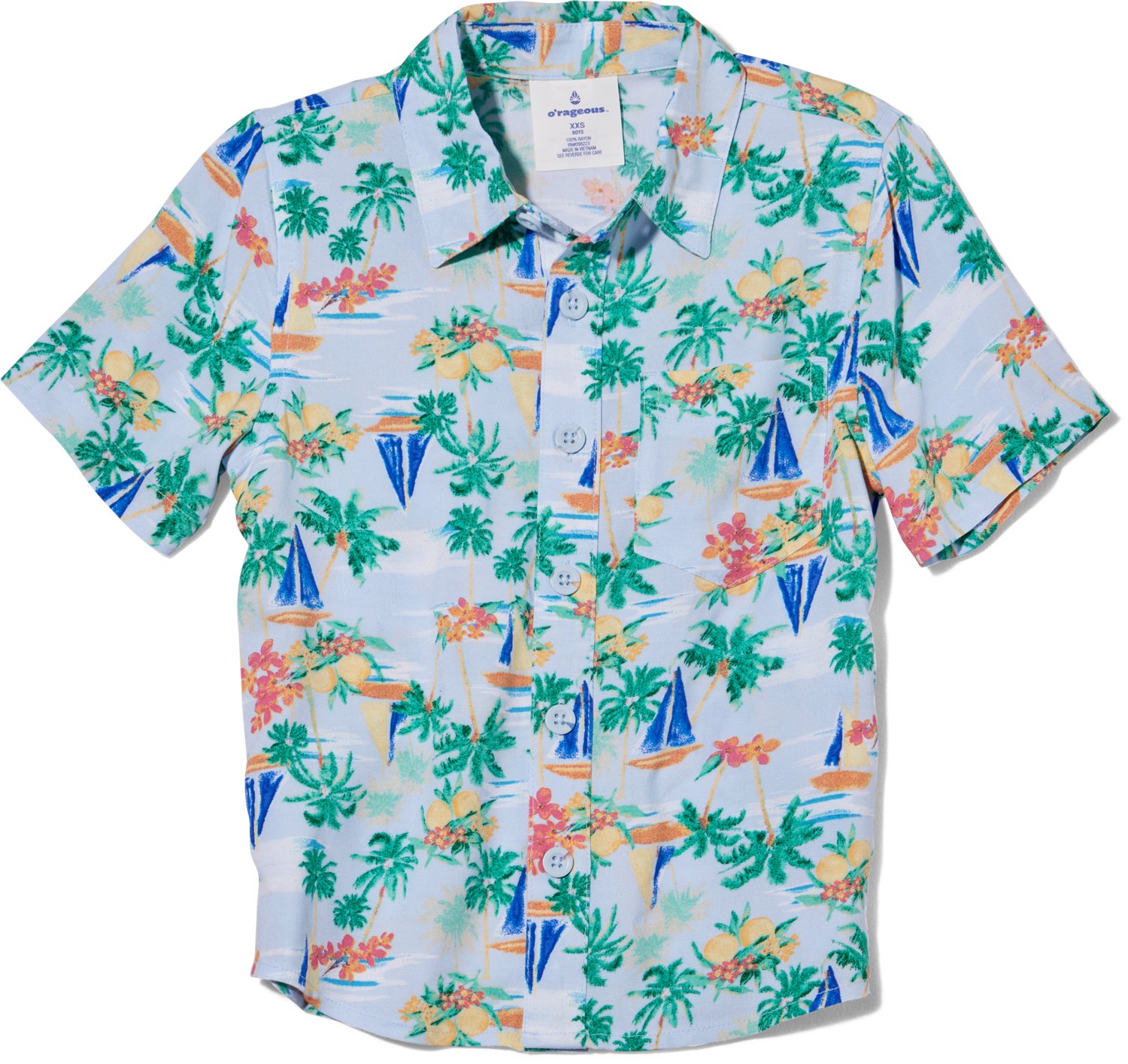Keep him protected during your beach trip with the O'Rageous Boys' 4-7 Toile Short Sleeve Cabana Swim Top. Made of 100% rayon for a natural feel, this button-down top keeps him covered while out in the sun. The lightweight material won't weigh him down in the water, and the printed graphic helps him stand out.