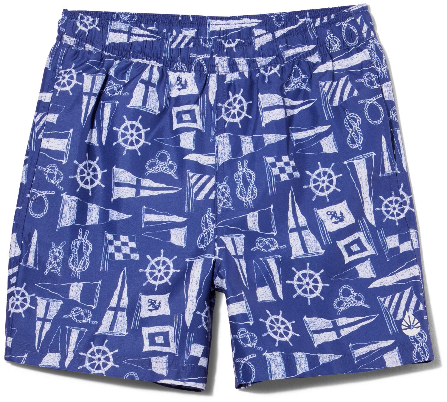He'll swim with ease in the O'Rageous Boys' Flag Printed Volley Shorts. These lightweight swim shorts are made for beach life. The polyester material won't weigh him down in the water, and the adjustable elastic waistband stays in place throughout the day. The UPF 30 technology shields his skin from UV rays, and the flag print shows off his fun-loving side.