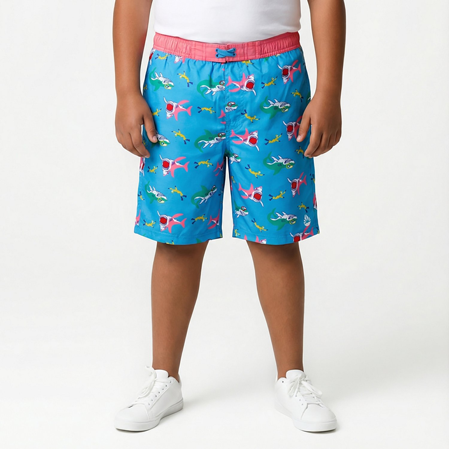 Keep him protected during your beach outing with the O'Rageous Boys' Shark Printed E Boardshorts. These comfortable boardshorts are made with a stretchy polyester and spandex blend with a playful shark print so he can swim and play with ease. The UPF 50 sun protection shields his skin, while the adjustable waistband stays in place all day.