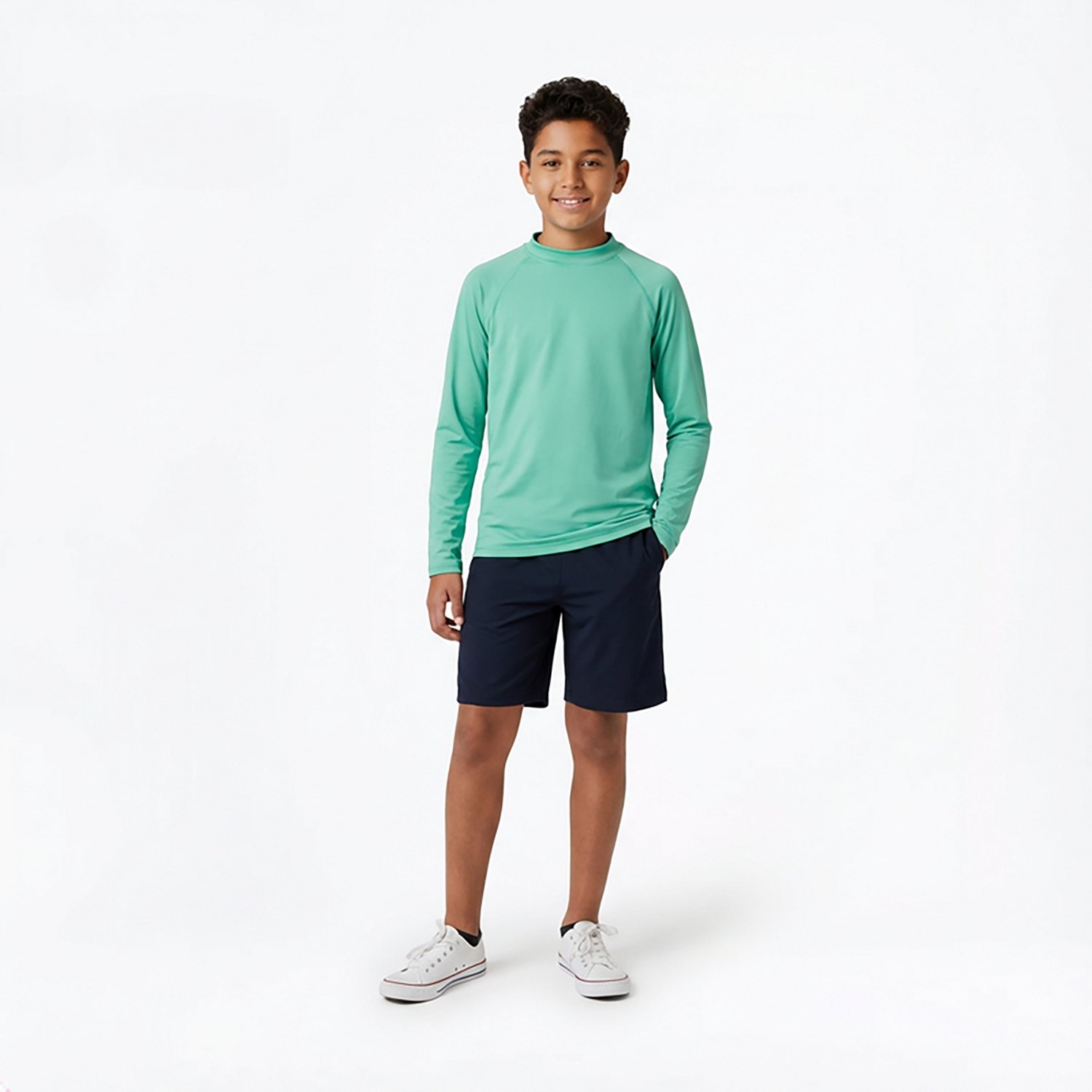 Keep your swimming-obsessed little one comfortable and safe in this O'Rageous Boys' Solid Long Sleeve Rash Guard. It is made of 88% recycled polyester and 12% spandex for durability and flexibility, and the rash guard delivers UPF 50+ protection to guard users from UV rays.