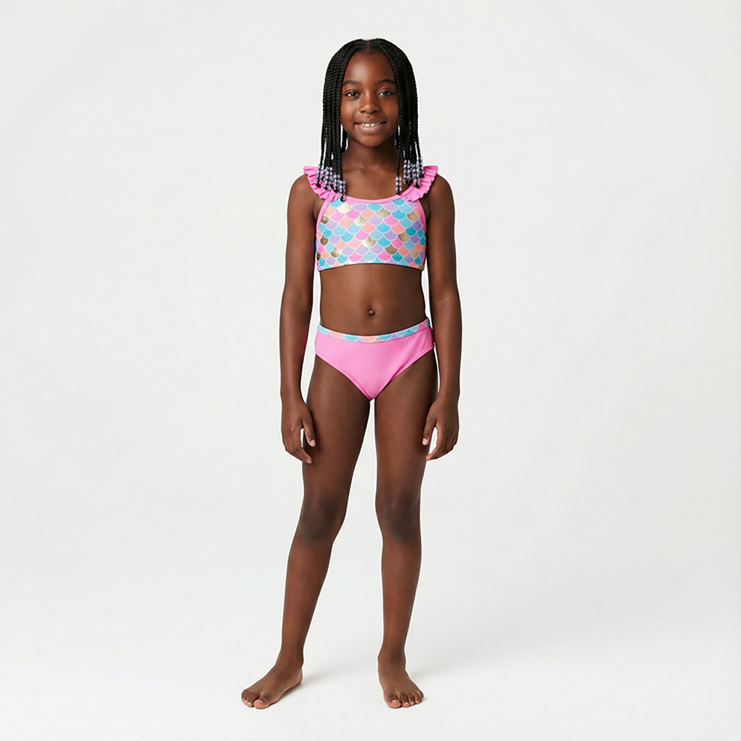 Splash around in the O'Rageous Girls' 4-7 Mermaid Scales 2-Piece Bikini. It is made of 80% polyester and 20% spandex. The mermaid scale pattern adds a touch of playfulness, and its set comes with a matching top and bottom.