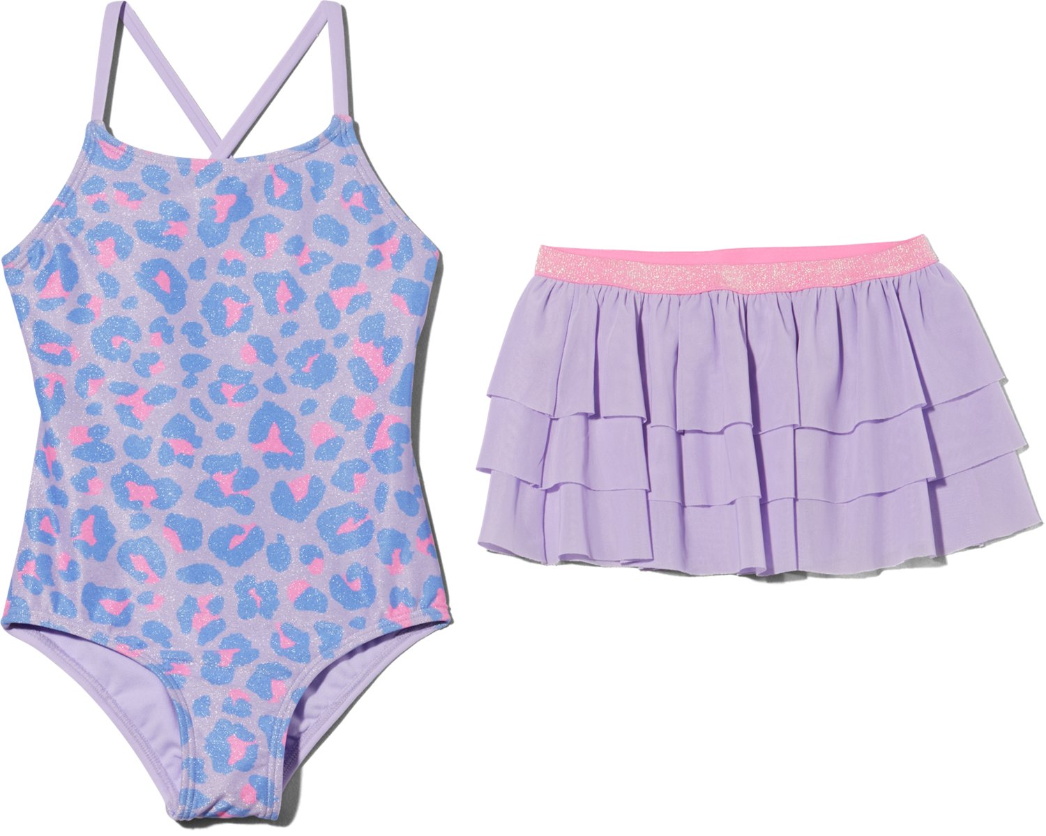 Splash around in the O'Rageous Girls' 4-7 Spotty Leopard 1-Piece Swimsuit Skirt Set. It is made of 83% polyester and 17% spandex. The spotty leopard pattern adds a touch of playfulness, and it comes with the 1-piece and matching skirt.