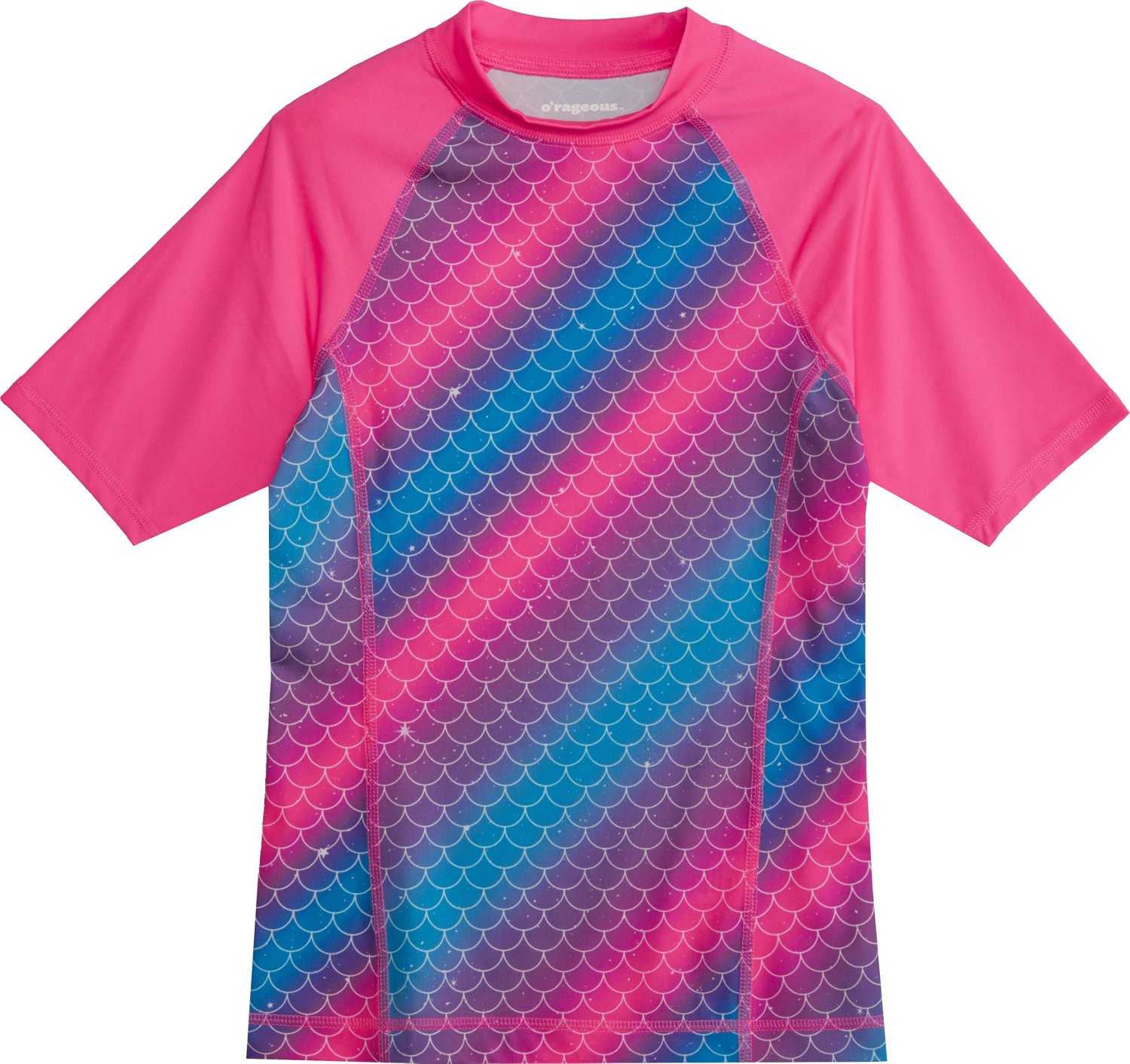 Swim around just like a mermaid in the O'rageous Girls' 4-7 Tie-Dye Mermaid Rash Guard. The recycled polyester/spandex construction stretches with your movements, and the UPF 50+ protection blocks harmful UV rays from your skin. The tie-dye mermaid design expresses your fun side.