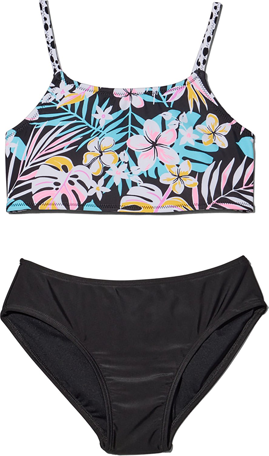 Splash around in the O'Rageous Girls' Midnight in the Tropics and Dotty Cheetah Reversible 2-Piece Swimsuit. It is made of 80% polyester and 20% spandex. The bikini design helps prevent awkward tan lines, and its reversible style allows them to change up their look.