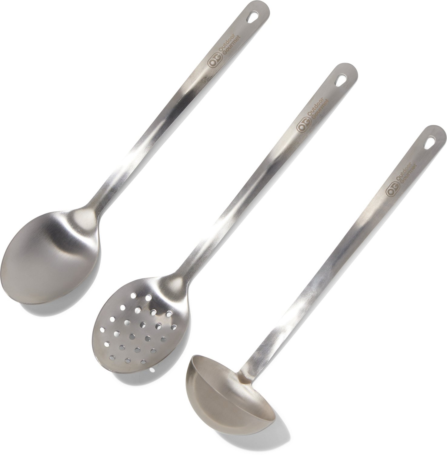 Serve your guests easily at your next dinner party or buffet with the Outdoor Gourmet 3-Piece Stainless-Steel Serving Set. The set includes a soup ladle, soup strainer and spoon. All pieces are constructed from stainless steel for long-lasting use.