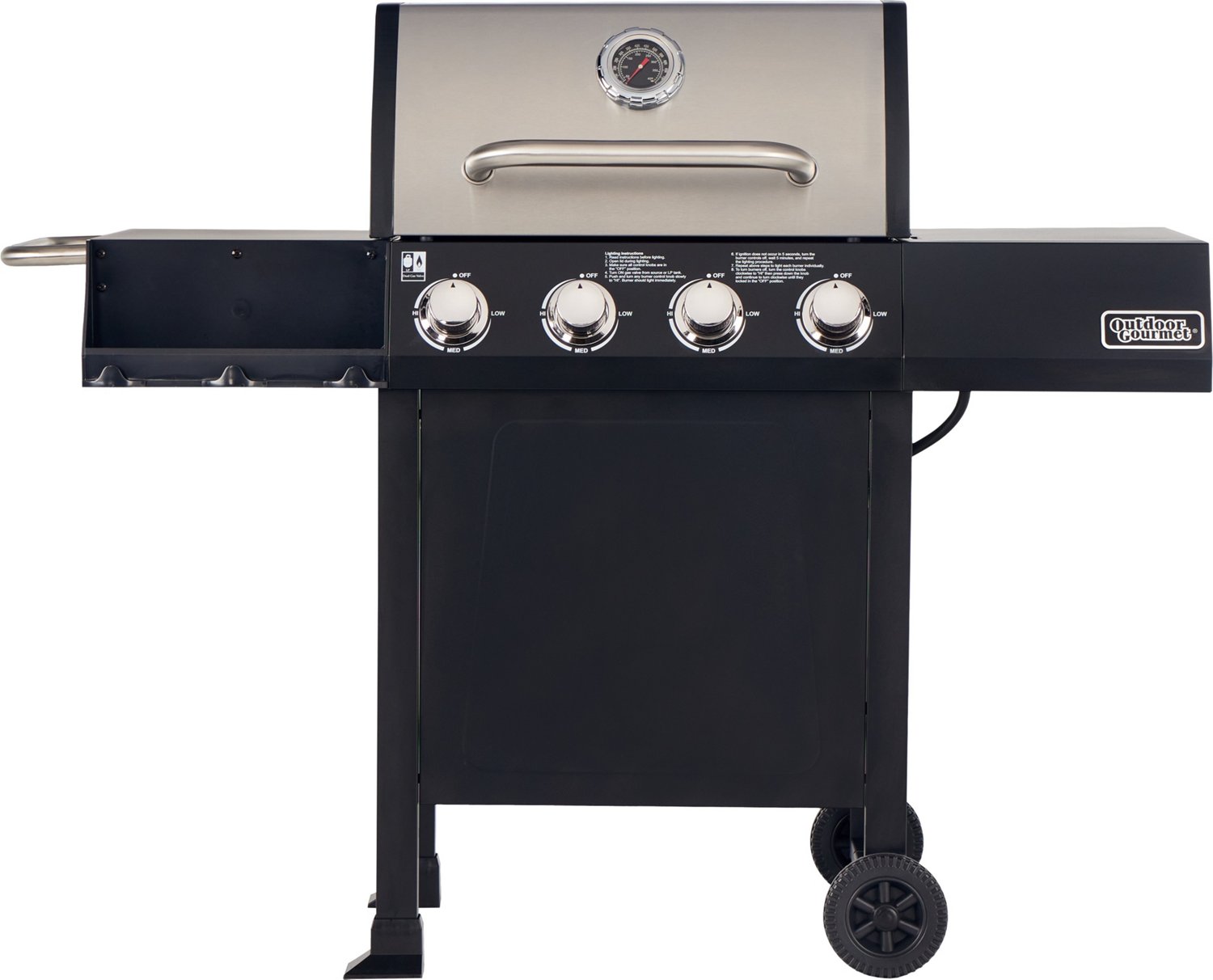 The Outdoor Gourmet 4-Burner Gas Grill features 4 stainless-steel burners that output 40,000 BTUs to provide powerful heat and high-performance cooking. The grill offers a 432 sq. in. cooking area and a 138 sq. in. secondary cooking area for ample grilling room, while the temperature gauge and safety-grip control knobs help regulate the temperature. 2 wheels. Warming rack. Built-in tool hooks. Front cart panel.