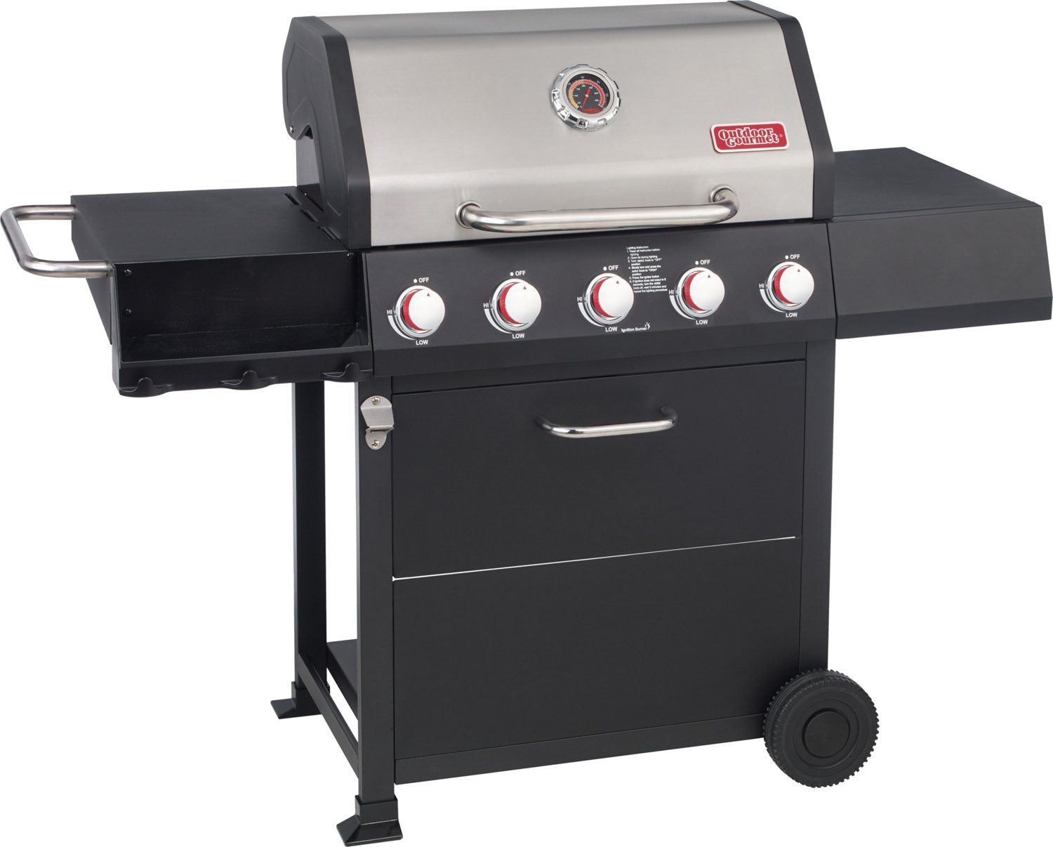 Turn your backyard into a barbecue paradise with the Outdoor Gourmet 5-Burner Gas Grill. The 50,000-BTU heat output delivers powerful heat performance, while the 513-square-inch cooking surface provides ample space for grilling up your favorite meats. The porcelain-coated fire box and cast-iron cooking grates are built for long-term use, and the removable grease cup allows for easy cleaning.