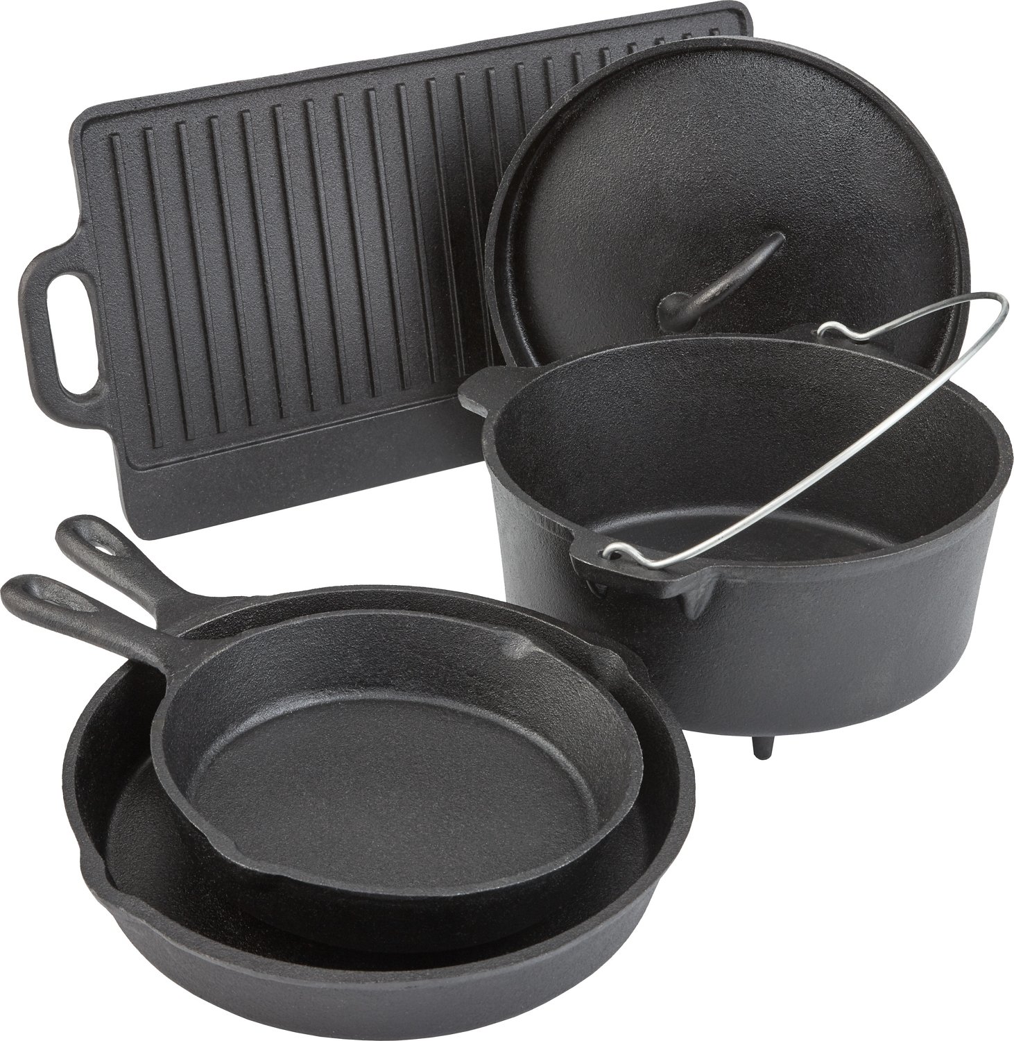 Satisfy your camp cooking needs with the Outdoor Gourmet™ 5-Piece Cast-Iron Cookware Set. The preseasoned all-cast-iron set is durable and includes skillets, a Dutch oven, a lid and a griddle to have you cooking a variety of delicious foods whether you're at the campfire or at home.