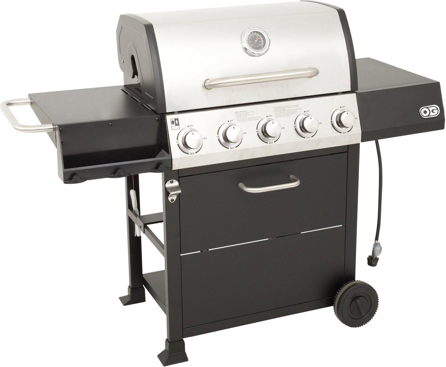 Get ready to grill up some delicious meals on the Outdoor Gourmet Classic 5-Burner Gas Grill. The cast-iron grates offer 513 square inches of cooking surface, perfect for big family meals and parties, and there are 2 side tables for prepping meals. A storage area keeps spices at the ready, and a set of easy-roll wheels makes moving the grill around the deck a breeze.