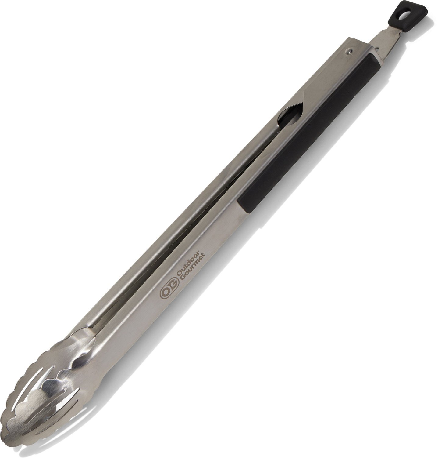 Easily flip burgers and hot dogs when grilling by using the Outdoor Gourmet Deluxe Stainless-Steel Tongs. The stainless-steel construction offers strength and durability, while the easy-grip handles promote a strong grasp as you handle food. The locking device keeps the tongs closed when you are not using them.