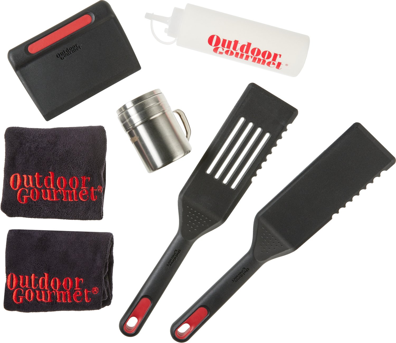 Equip your own home grill with the Outdoor Gourmet Griddle Starter Set. This handy set comes with everything you need to get started, including a spatula, slotted spatula, scraper, squirt bottles, seasoning shaker and towel. Nonscratch coatings protect your griddle surface.