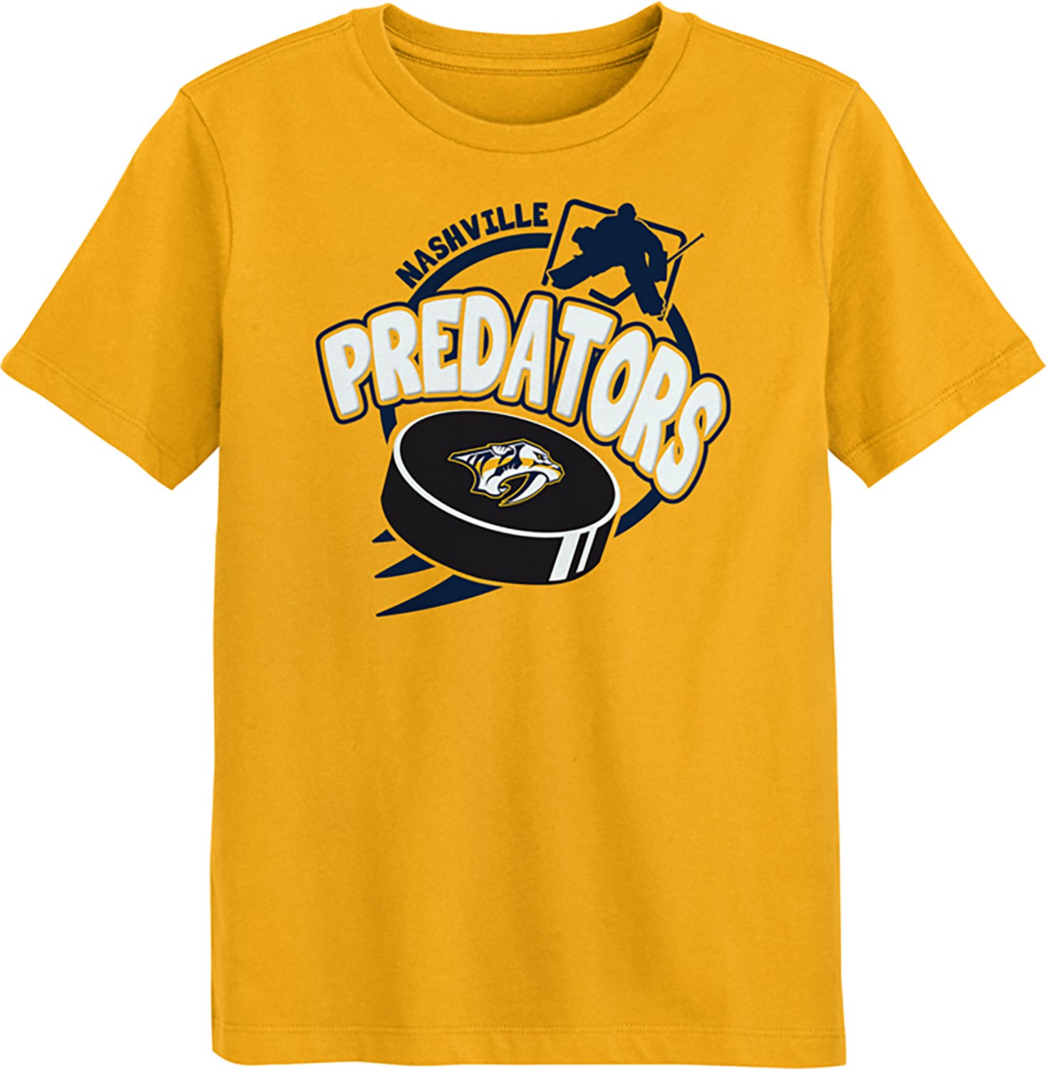 Cheer on your favorite team while wearing the Outerstuff Boys' 4-7 Nashville Predators Slap Shot T-shirt. The 100% cotton jersey construction helps keep you comfortable throughout the day, while the screen-printed team graphic puts your fan spirit on display.