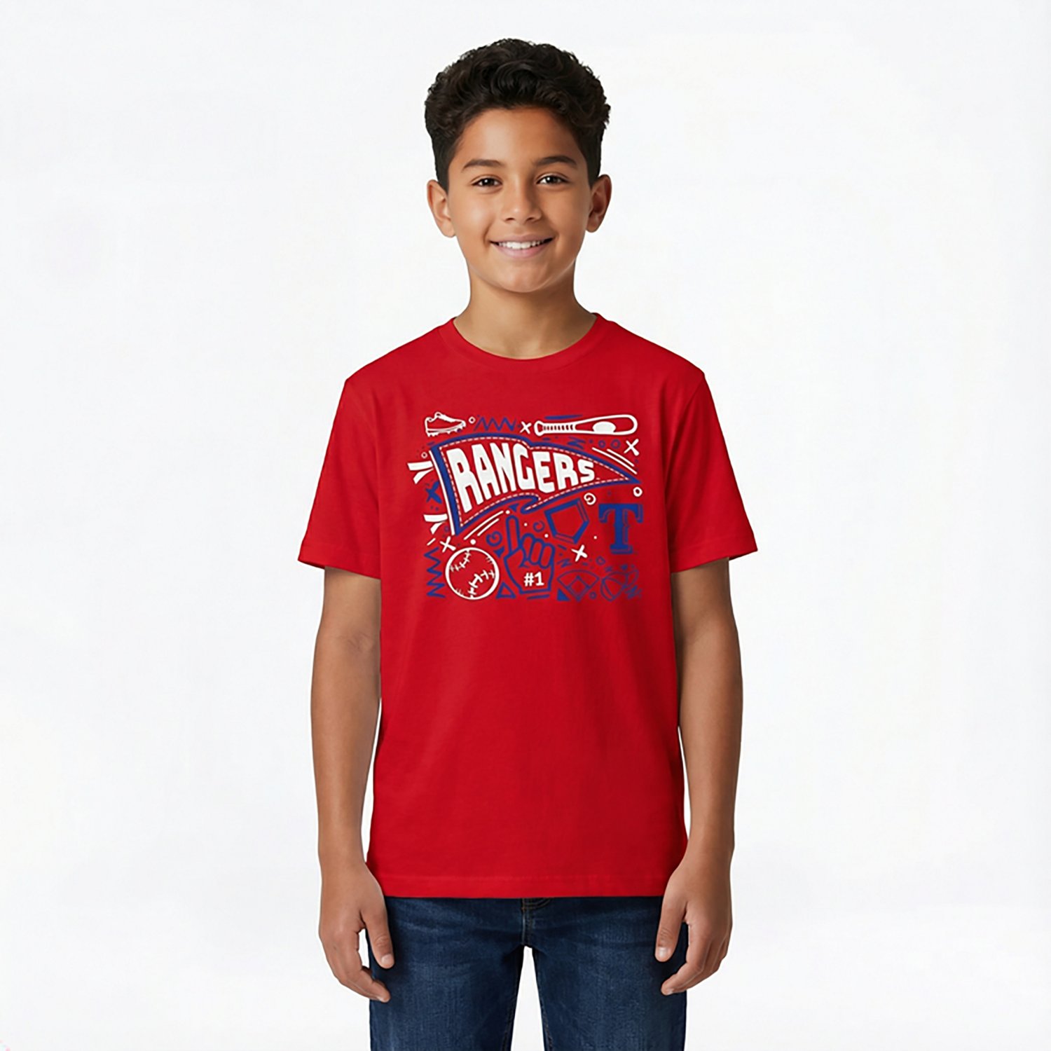 Put your fan pride on display when you wear the Outerstuff Boys' 4-7 Rangers Ball Park Fun T-shirt. The cotton fabric provides a comfortable feel throughout the day, and the printed team graphic delivers an eye-catching appearance to fellow fans.
