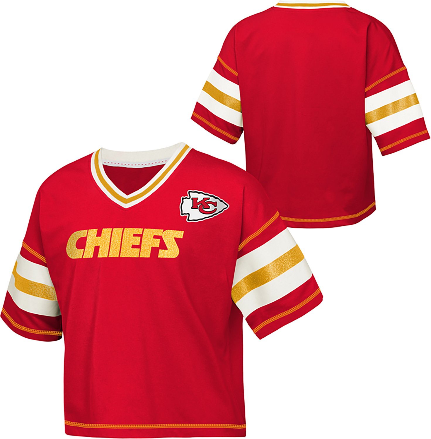 If you want to celebrate in style, throw on the Outerstuff Girls' Chiefs Grid Iron Jersey T-shirt. This T-shirt is made of cotton and polyester jersey for a super-soft feel and features the school name and logo in a glitter screen-print style on the front for an intriguing look.