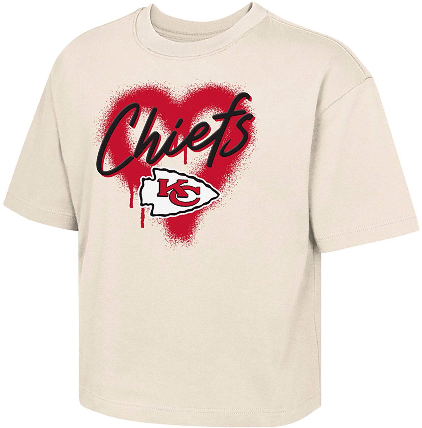 Put your fan pride on display when you wear the Outerstuff Girls' Chiefs Spray Heart Boxy T-shirt. The 100% cotton jersey construction provides a soft, comfortable feel, while the team print shows off your fandom.