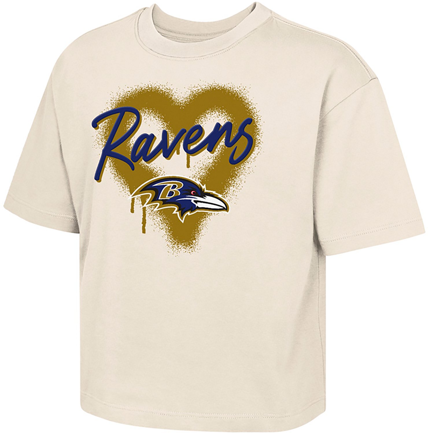 Put your fan pride on display when you wear the Outerstuff Girls' Ravens Spray Heart Boxy T-shirt. The 100% cotton jersey construction provides a soft, comfortable feel, while the team print shows off your fandom.