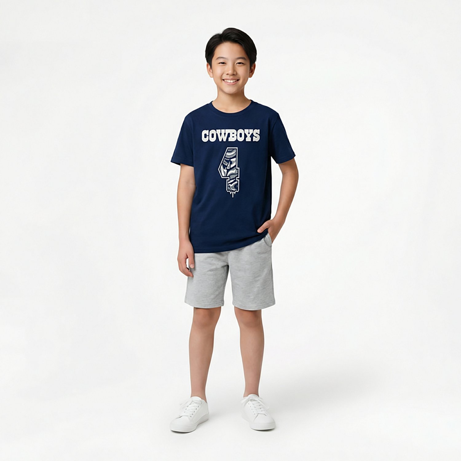 If you're looking to shout out your love for the Cowboys and their star QB, put on the Outerstuff Kids' Dallas Cowboys Dak Prescott #4 Name & Number Drip T-shirt. This tee is made of 100% cotton to offer the softness you need, and the team name and logo graphics and player name and number graphics make it easy to see who you cheer for.