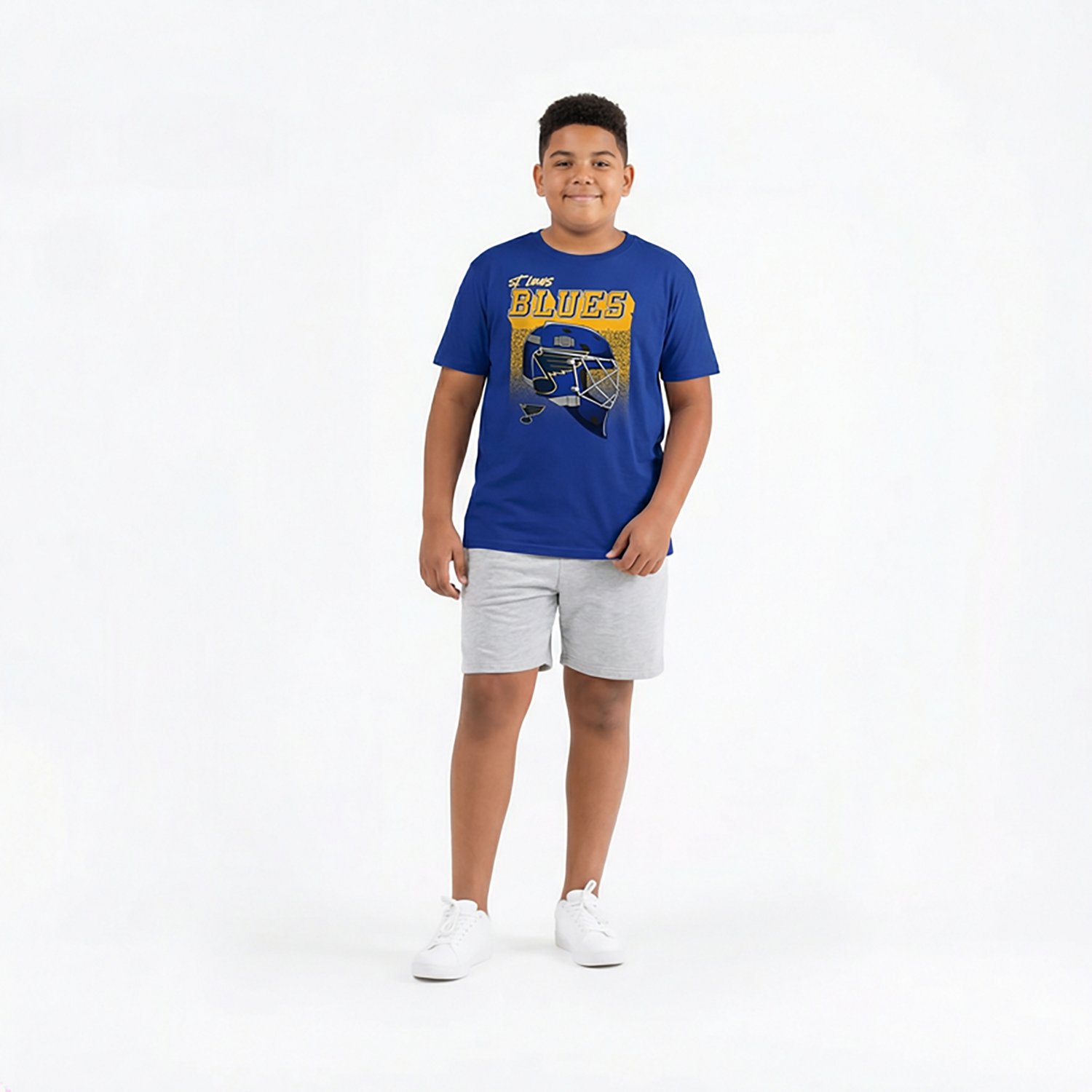 Screen print of St. Louis Blues graphics decorate the front chest